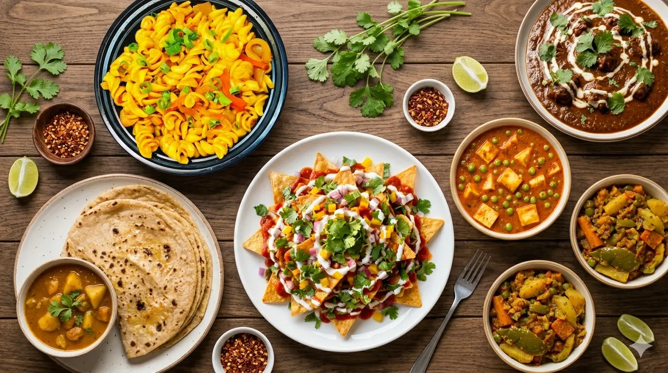 A creative fusion snack featuring a crispy aloo tikki patty loaded with spiced noodles and paneer, layered in a soft bun with chutneys. A fun street-food-style treat that blends desi flavours with a modern twist — loved by kids and adults alike.